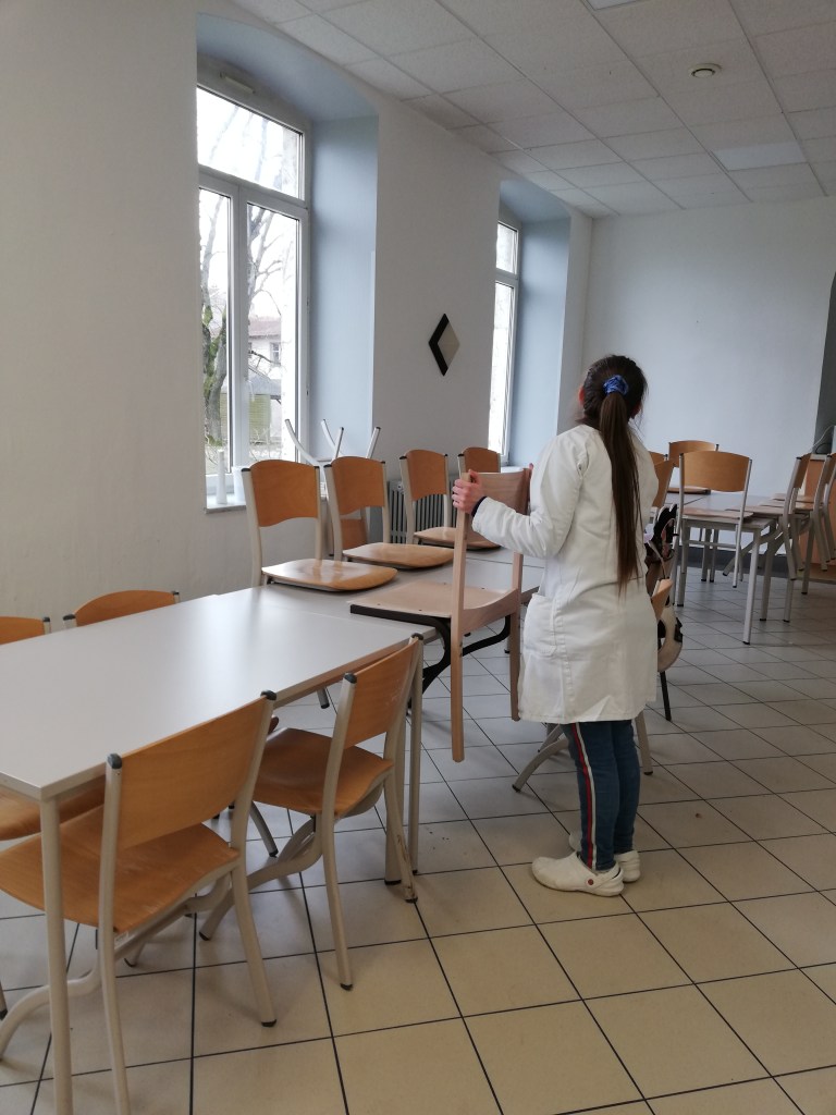 Avec Amélia, j’ai nettoyé le réfectoire.